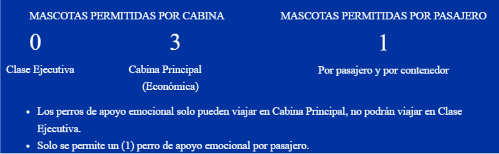 • Pasajeros que viajen con perros de servicio o apoyo emocional que no cumplan con el peso requerido* o que requieran más espacio, podrán comprar un asiento adicional para que el animal cuente con suficiente espacio a los pies de su dueño, garantizando de tal forma el cumplimiento de los reglamentos nacionales e internacionales de seguridad aérea, los cuales impiden la obstrucción del pasillo de la aeronave y disponen la presencia de suficiente espacio en caso de evacuación.