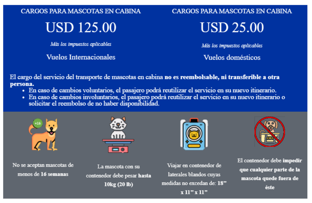 • Copa Airlines sólo acepta perros pequeños y gatos (máximo de 10 kg incluyendo el contenedor) como mascota en cabina.