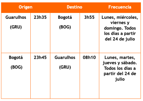SAN PABLO/GUARULHOS – BOGOTÁ: a partir del 31/03/2024 (vuelo Bogotá-San Pablo a partir del 1/4/2024)