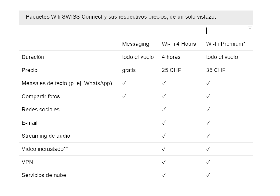 El nuevo paquete Wifi «Messaging» permite ahora a los viajeros/as chatear o compartir fotos con sus seres queridos a bordo de todos los vuelos de larga distancia de SWISS. La oferta es gratuita y está disponible durante todo el vuelo, sin límite de transferencia de datos.A quienes deseen disfrutar de una experiencia online más variada y mejorada, SWISS les ofrece dos paquetes integrales «Wi-Fi 4 Hours» y «Wi-Fi Premium», ambos de pago.