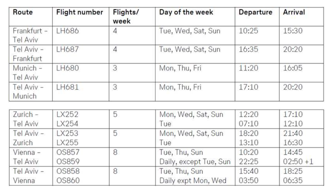 Las líneas aéreas del Grupo Lufthansa planean reanudar los vuelos a Tel Aviv a partir del 08 de enero de 2024, inicialmente con 20 conexiones semanales. En una primera fase, Lufthansa Airlines ofrecerá cuatro salidas semanales desde Tel Aviv a Frankfurt y tres vuelos semanales a Múnich. Austrian Airlines tiene previstas ocho conexiones semanales a Viena, mientras que SWISS realizará cinco vuelos semanales desde Tel Aviv a Zúrich. En conjunto, las líneas aéreas del Grupo Lufthansa ofrecerán un total de 20 conexiones semanales desde y hacia Tel Aviv, lo que equivale a aproximadamente el 30 por ciento del horario de vuelos regular. Para estos servicios, las líneas aéreas utilizarán aeronaves de la familia Airbus A320.