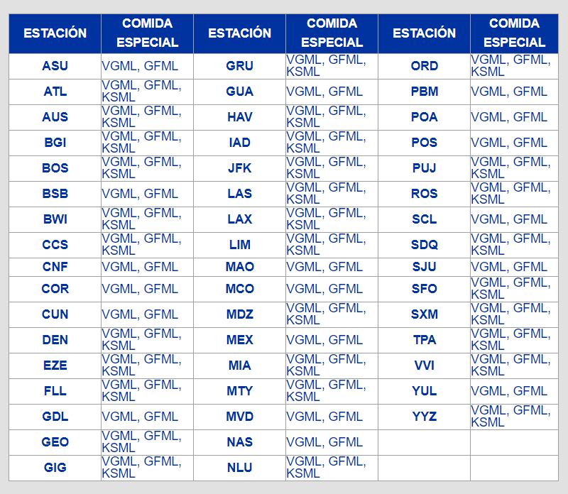 A continuación, detalle de las comidas especiales en las siguientes rutas desde/hacia Panamá (PTY):
